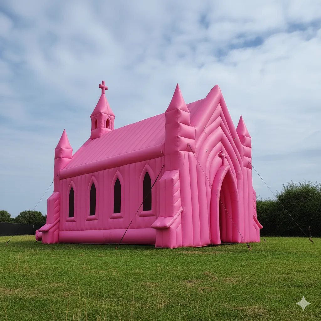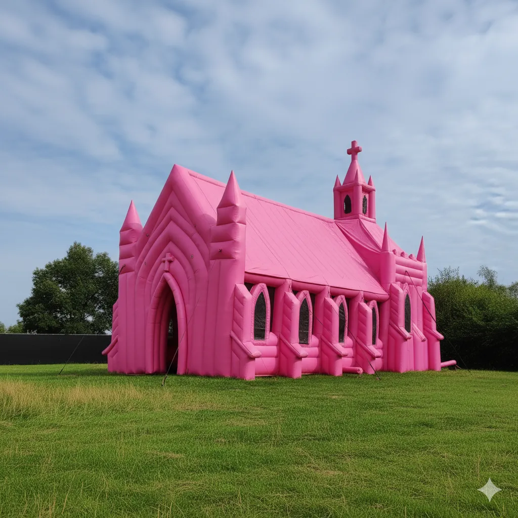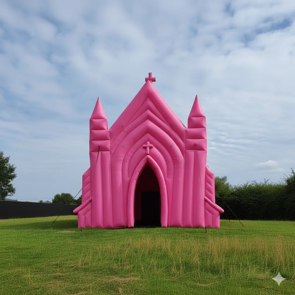 Geen echte kerk, maar een hilarische en unieke beleving: onze roze opblaasbare kerk is een echte showstopper op ieder evenement. Deze gigantische feesttent in de vorm van een kerk is uitgevoerd in felroze en is volledig opblaasbaar. Binnen enkele uren opgebouwd op locatie en nét zo snel weer afgebouwd. Met een hoogte van maar liefst 12 meter (ja, inclusief kerktoren!) is deze tent van ver al te spotten. Ideaal als opvallende festivallocatie, overdekte party area of creatieve insteek voor een bedrijfsfeest of borrel.
